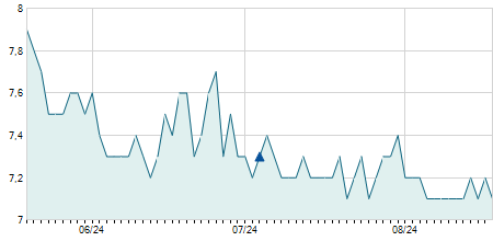 | 31/08/2021 | +0,60 / +9,09% | 6,70 | 7,20 | 6,60 | 7,20 | 7,12 | 7,20 | 215.300 |   |