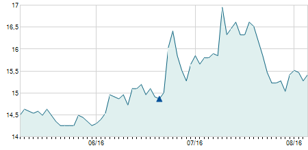 | 18/01/2023 | +0,90 / +6,92% | 13,90 | 14,30 | 13,30 | 13,90 | 13,51 | 10,62 | 4.700 |   |