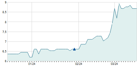 | 09/05/2018 | +0,10 / +1,18% | 9,00 | 9,00 | 8,60 | 8,60 | 8,97 | 4,01 | 1.400 |   |
