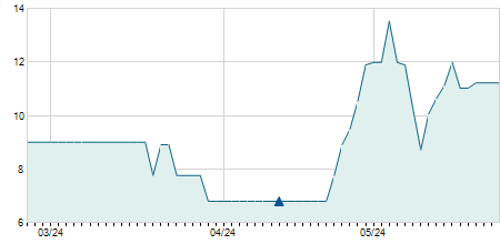 | 13/03/2019 | +0,90 / +9,78% | 9,20 | 10,10 | 9,20 | 10,10 | 9,23 | 5,28 | 3.100 |   |