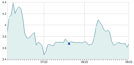 | 24/04/2019 | -0,90 / -9,09% | 9,00 | 9,80 | 9,00 | 9,00 | 9,20 | 4,71 | 400 |   |