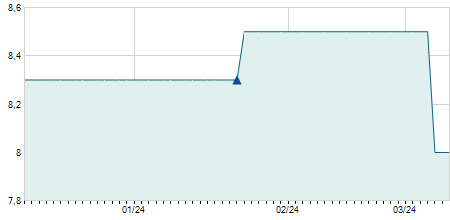 | 01/04/2024 | -0,10 / -0,68% | 14,80 | 14,80 | 14,40 | 14,50 | 14,60 | 14,04 | 7.300 |   |