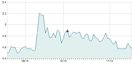 | 12/06/2014 | -0,60 / -4,48% | 12,60 | 12,90 | 12,60 | 12,80 | 12,80 | 5,03 | 697.850 |   |