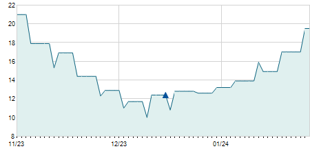 | 05/06/2018 | -0,10 / -3,45% | 2,80 | 2,80 | 2,80 | 2,80 | 2,80 | 2,80 | 48.600 |   |