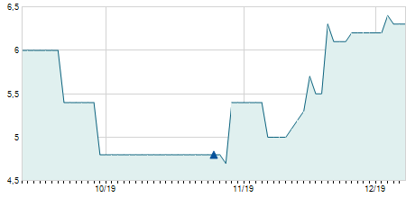 | 06/07/2011 | -0,30 / -5,08% | 6,20 | 6,20 | 5,60 | 5,60 | 6,00 | 5,29 | 1.500 |   |