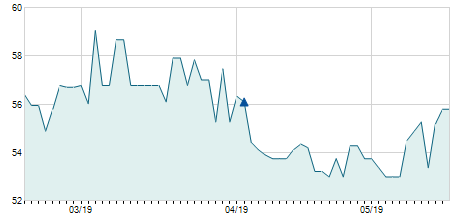 | 30/10/2007 | -4,30 / -6,60% | 59,00 | 65,00 | 59,00 | 60,90 | 60,98 | 60,90 | 52.200 |   |