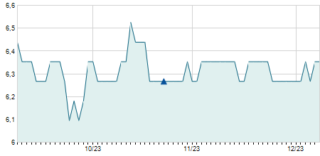 | 12/12/2023 | 0,00 / 0,00% | 7,20 | 7,40 | 7,20 | 7,30 | 7,23 | 6,27 | 28.700 |   |