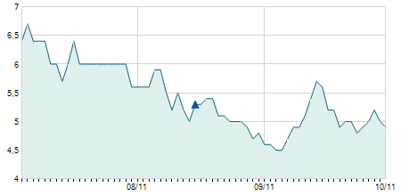 | 27/06/2014 | -0,20 / -2,06% | 9,60 | 9,70 | 9,30 | 9,50 | 9,50 | 9,50 | 49.300 |   |