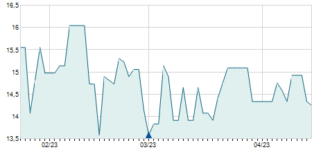 | 28/07/2014 | -0,40 / -4,26% | 9,40 | 9,40 | 9,00 | 9,00 | 9,00 | 9,00 | 21.100 |   |
