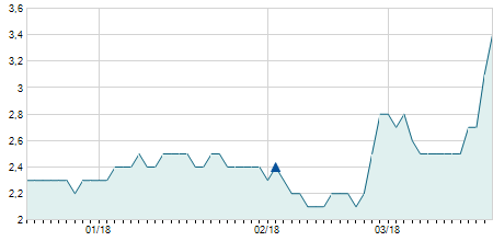 | 02/10/2023 | +0,10 / +1,20% | 8,30 | 8,40 | 8,30 | 8,40 | 8,35 | 7,79 | 4.500 |   |