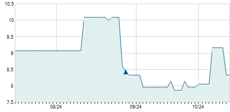 | 04/03/2008 | -2,70 / -7,94% | 31,30 | 31,30 | 31,30 | 31,30 | 31,30 | 31,30 | 8.200 |   |