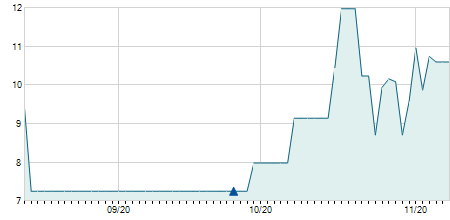 | 03/10/2011 | -0,80 / -6,40% | 12,90 | 13,00 | 11,70 | 11,70 | 12,00 | 11,70 | 141.900 |   |