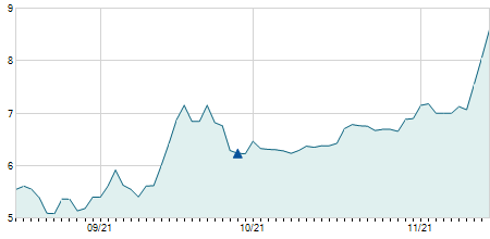 | 06/12/2021 | -0,75 / -6,88% | 10,90 | 11,10 | 10,15 | 10,15 | 10,52 | 9,18 | 148.700 |   |