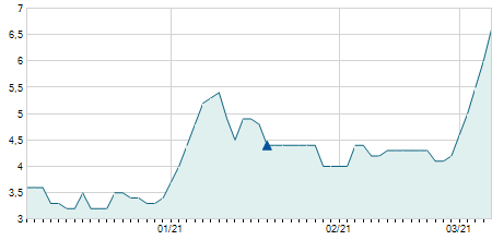 | 03/06/2022 | -0,17 / -2,40% | 7,00 | 7,09 | 6,90 | 6,92 | 6,98 | 6,47 | 122.000 |   |