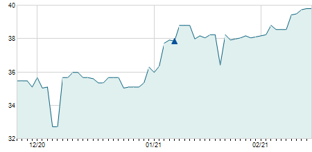 | 14/05/2020 | -0,05 / -0,24% | 20,80 | 21,30 | 20,80 | 21,05 | 21,12 | 17,26 | 122.300 |   |