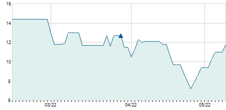 | 16/05/2023 | -0,10 / -0,88% | 11,30 | 11,60 | 11,00 | 11,30 | 11,25 | 9,02 | 107.400 |   |
