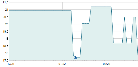 | 22/10/2019 | -0,08 / -4,02% | 1,99 | 1,99 | 1,90 | 1,91 | 1,93 | 1,91 | 400.400 |   |
