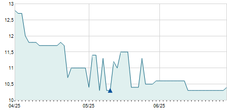 | 08/11/2018 | -0,80 / -7,27% | 10,00 | 10,20 | 10,00 | 10,20 | 10,16 | 6,53 | 2.500 |   |