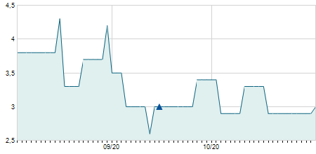 | 09/10/2018 | -0,05 / -0,39% | 13,00 | 13,00 | 12,80 | 12,80 | 12,90 | 9,18 | 410 |   |