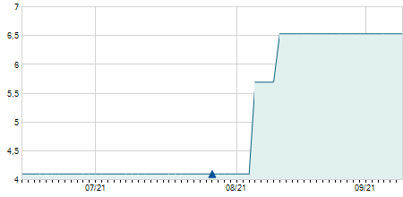 | 06/03/2018 | -0,10 / -2,17% | 4,50 | 4,50 | 4,50 | 4,50 | 4,50 | 4,22 | 500 |   |