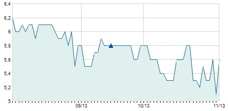 | 10/10/2014 | -0,30 / -3,80% | 8,10 | 8,10 | 7,60 | 7,60 | 7,65 | 2,54 | 15.700 |   |