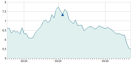 | 04/12/2024 | -0,30 / -6,52% | 4,60 | 4,70 | 4,30 | 4,30 | 4,38 | 4,30 | 5.500 |   |