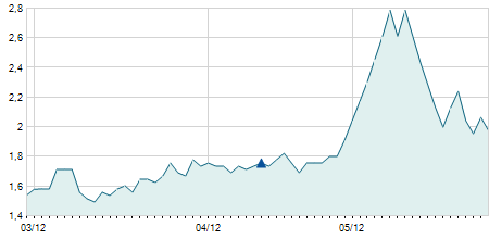 | 19/08/2015 | +0,90 / +2,58% | 34,50 | 36,00 | 34,40 | 35,80 | 35,21 | 5,74 | 120.200 |   |