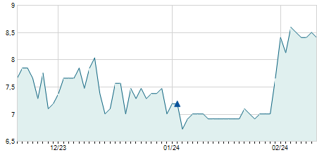 | 08/09/2023 | -0,30 / -13,04% | 2,60 | 2,60 | 2,00 | 2,00 | 2,20 | 2,00 | 600 |   |