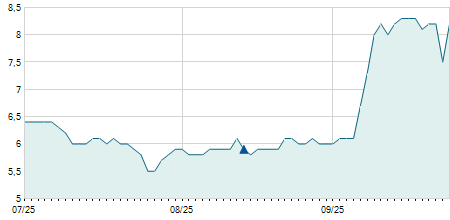 | 09/11/2021 | -0,20 / -2,13% | 9,30 | 9,40 | 9,00 | 9,20 | 9,20 | 9,20 | 54.000 |   |