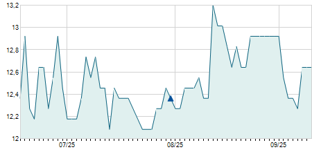 | 13/04/2021 | +0,30 / +4,17% | 7,40 | 7,50 | 7,30 | 7,50 | 7,42 | 7,50 | 18.000 |   |