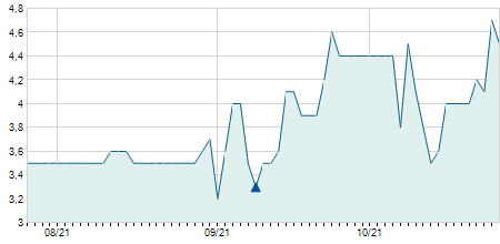 | 11/06/2012 | -0,10 / -5,26% | 1,80 | 1,80 | 1,80 | 1,80 | 1,80 | 1,80 | 3.890 |   |