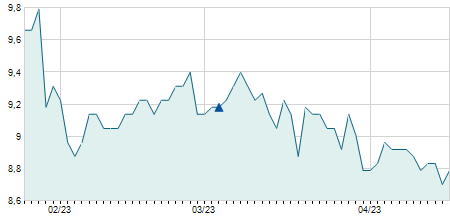 | 09/07/2021 | -0,10 / -1,56% | 6,30 | 6,30 | 6,30 | 6,30 | 6,30 | 5,80 | 11.000 |   |